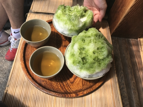 夏期限定赤福氷!かき氷に宇治抹茶がかけられ中にはあんこと餅が埋もれてます。