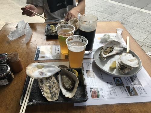 昼間から地ビールと焼き牡蠣で乾杯!(ちなみに友人K君ともう一人F君の計3人です)