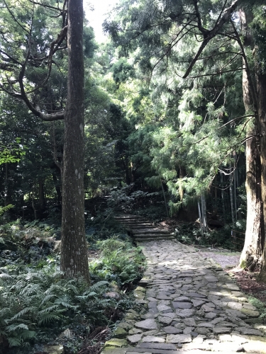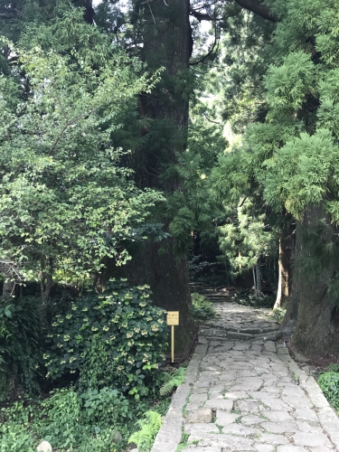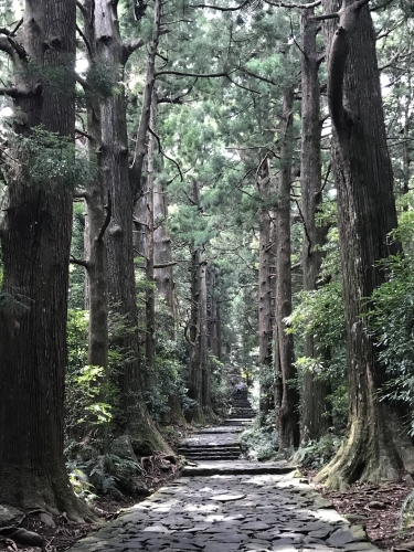 木々の1本1本がとても巨大でその間に伸びる石畳の階段。