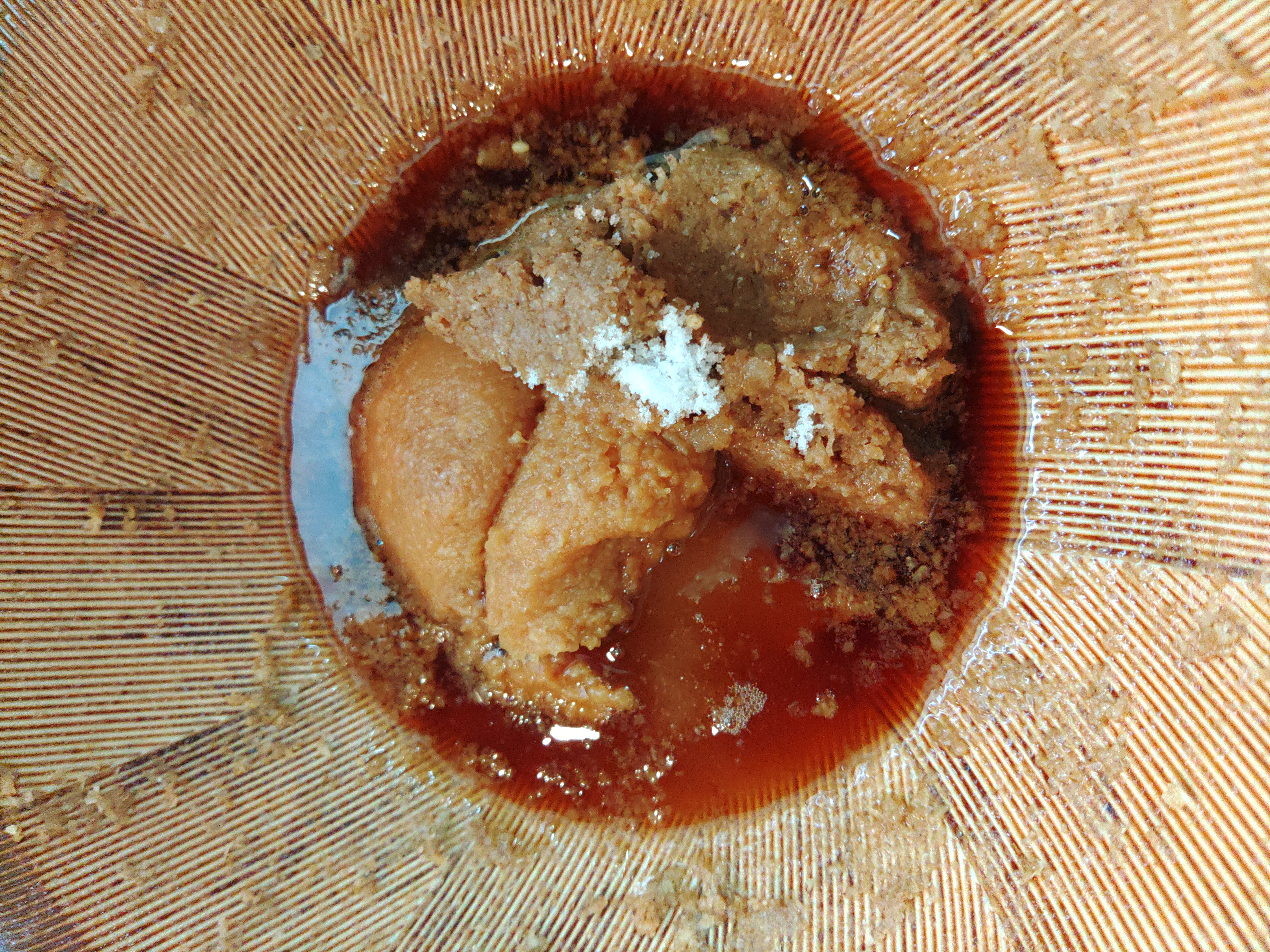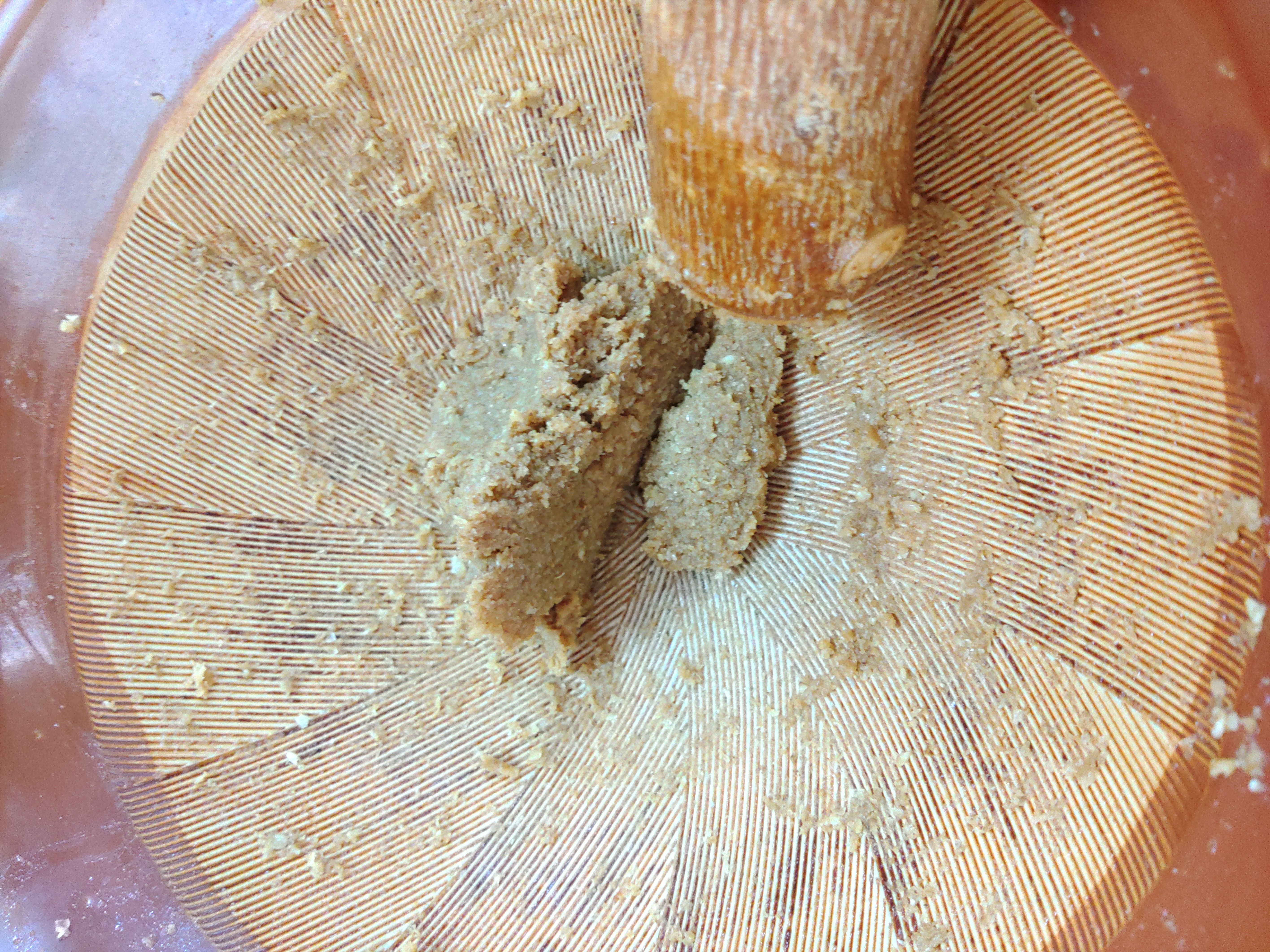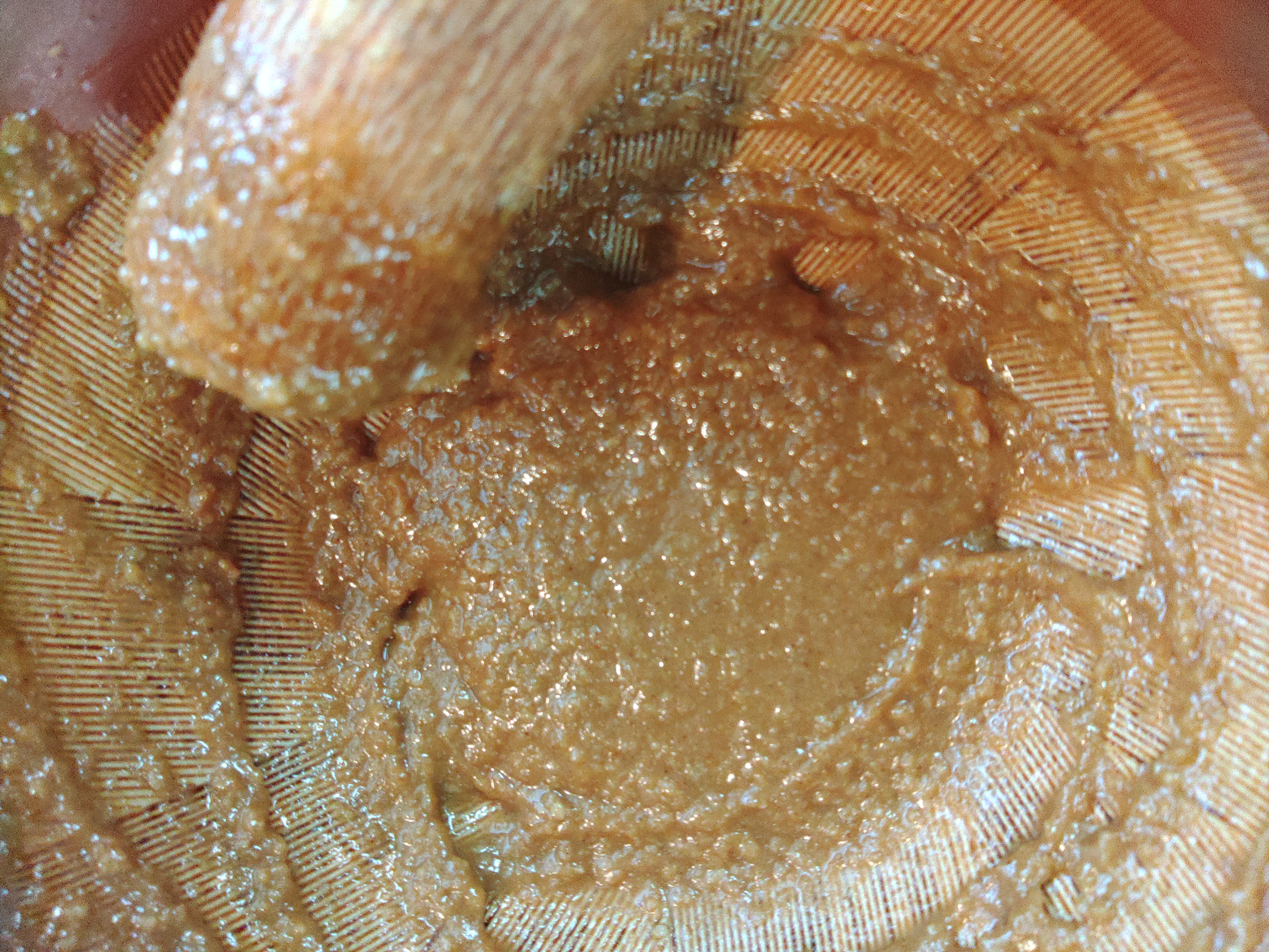 この時、砂糖の粒子、味噌の粒子がしっかりつぶれるように擦り合わせていってください。