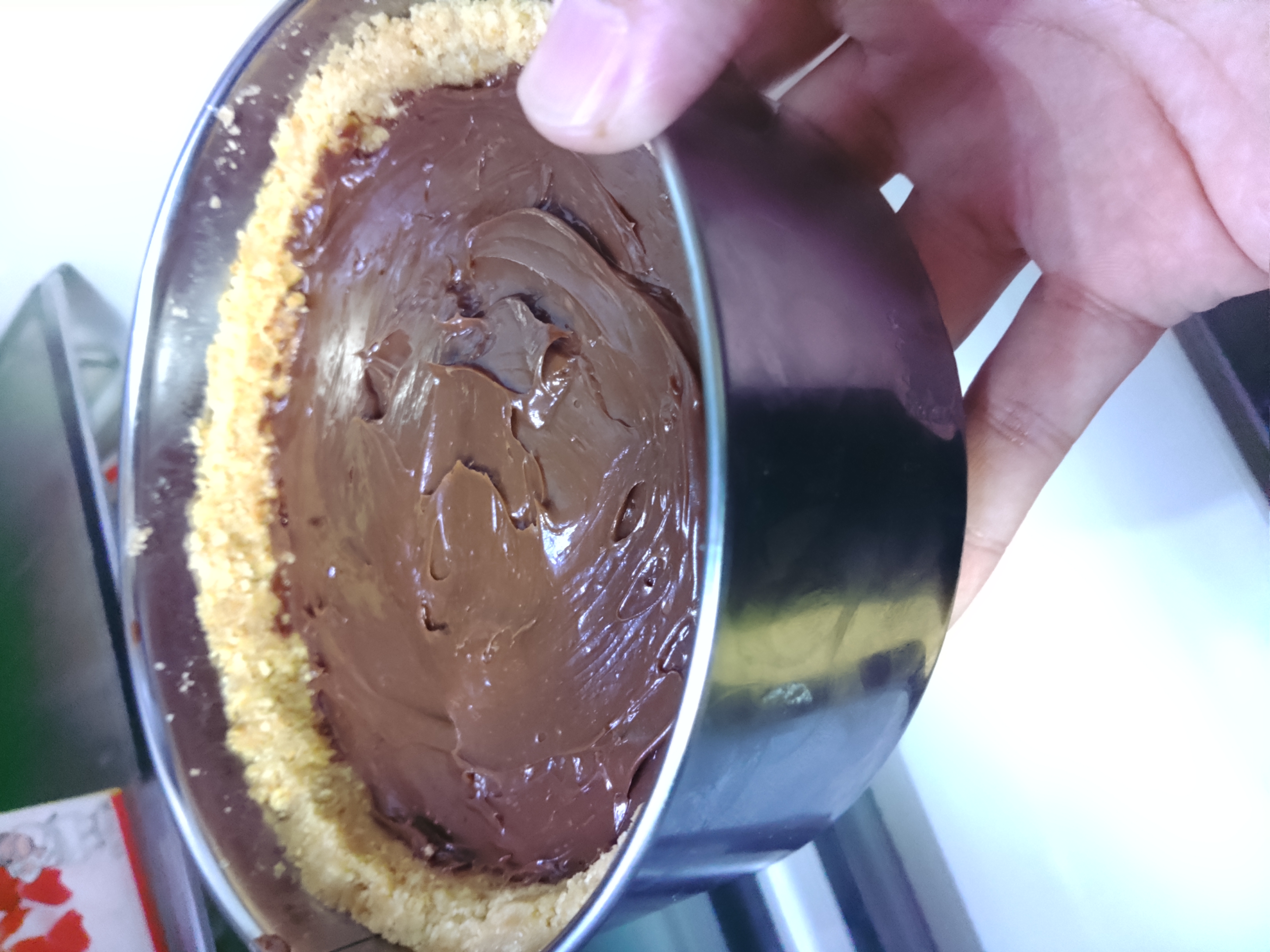 ここで皆様に注意喚起なのですが、チョコに生クリームを投入するのはタルト生地をしっかり冷やし終わってからの方が良いです。