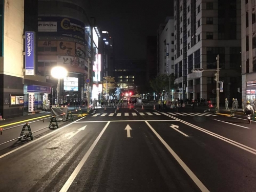▲すぐに通行止め。ちょうど正面に見えるのがJR博多駅です。報道陣もすぐに駆けつけてました。